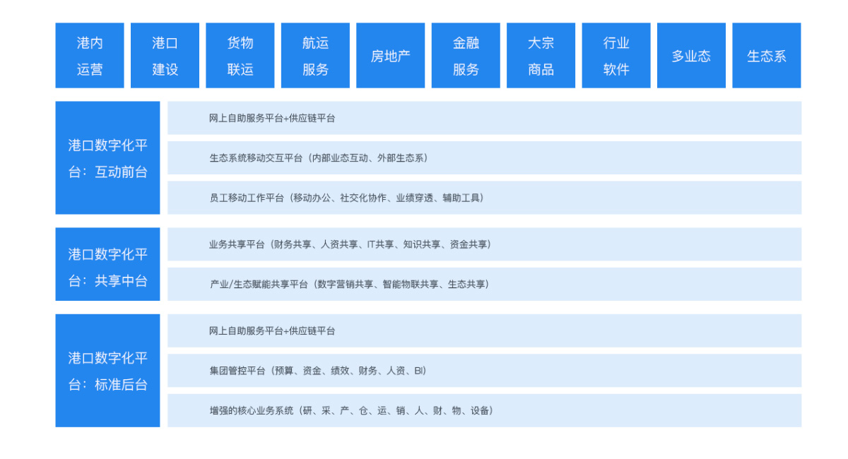 以蒼穹平臺為依托,融合門戶、財務(wù)管理、資金管理、預(yù)算管理、供應(yīng)鏈管理、人力資源管理等諸多管理系統(tǒng),原生開發(fā)港口生產(chǎn)作業(yè)和調(diào)度系統(tǒng),構(gòu)建智慧港口中臺,助力港口物流數(shù)字化轉(zhuǎn)型